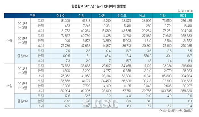 한중항로도 수출화물은 줄고 수입화물은 상승곡선을 그렸다. 황해정기선사협의회에 따르면 1분기 한중 수출항로 물동량은 27만9935TEU로, 5.1% 감소했다. 반면 수입물동량은 35만8830TEU로, 10.4% 성장하는 호성적을 일궜다. 수출화물의 경우 환적화물 성장에도 불구하고 로컬화물 감소로 하향세를 나타냈다. 수입화물은 로컬 및 환적 모두 높은 성장률을 기록했다. 특히 상하이, 톈진(신강), 닝보 기점의 수입화물 성장 폭이 컸다. 상하이에서 한국으로 수송된 물동량은 17.9%, 톈진에서 수입된 물동량은 16.8%, 닝보에서 수입된 물동량은 17.7%의 증가율을 각각 보였다.