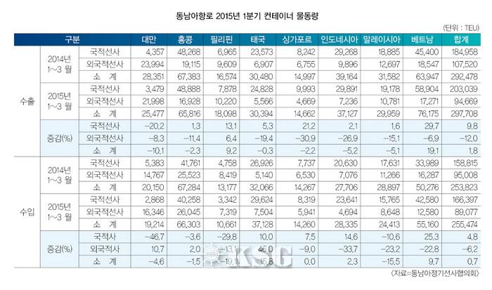 동남아항로 물동량은 수출과 수입 모두 소폭의 성장세를 띠었다. 동남아정기선사협의회에 따르면 1분기 동남아항로 물동량은 55만3182TEU로, 지난해 같은 기간의 54만6301TEU에 비해 1.3% 성장했다. 이 중 수출물동량은 1.8% 늘어난 29만7708TEU, 수입화물은 0.7% 늘어난 25만5474TEU였다.