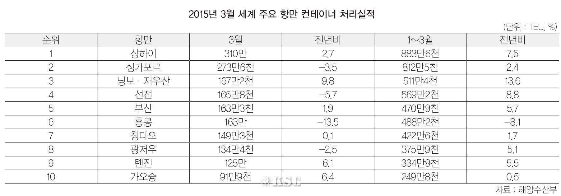 상하이항은 세계에서 가장 많은 컨테이너 화물을 소화했다. 1분기까지 883만6천TEU를 처리, 지난해에 비해 7.5% 성장했다. 싱가포르항과 선전항 역시 각각 2.4% 8.8% 증가했다. 부산항 역시 5.7% 상승하며 선진 항만들의 상승대열에 합류했다.