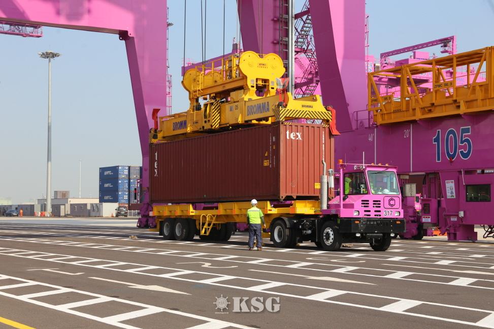 | ▲선광인천컨테이너터미널(SNCT)에서 하역작업 막바지 점검이 한창인 가운데 28일 오전 SNCT 1번 선석에 테스트선으로 접안한 천경해운 소속 < 스카이플라워 >호로부터 내려진 컨테이너가 야드 트레일러에 옮겨지고 있다. |