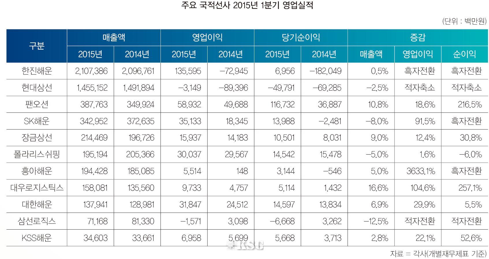 벌크선 경쟁자인 팬오션과 SK해운은 나란히 589억원 351억원의 영업이익을 달성했다. 팬오션은 10.8%의 매출액 신장을 거두며 8%의 역신장에 운 SK해운을 제치고 외형 기준 3위로 올라섰다. 해운시장의 핫아이콘 장금상선과 폴라리스쉬핑은 159억원 300억원의 흑자 성적을 신고했다. 장금상선도 9%의 성장률로, 마이너스 성장을 기록한 폴라리스쉬핑을 외형에서 제쳤다.