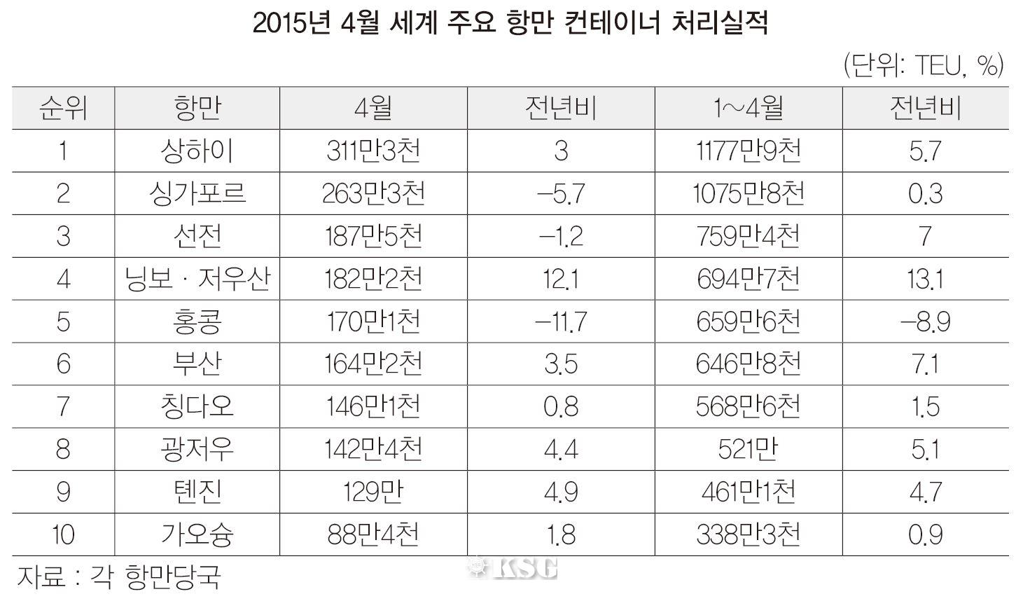 싱가포르와 선전항은 월별 실적에서 2014년 4월에 비해 소폭 하락한 실적을 신고하며 세계 주요 항만 중에서 유일하게 마이너스 성장을 보였다. 싱가포르항은 4월 6% 소폭 하락한 263만3천TEU를, 선전항은 1.2% 떨어진 187만5천TEU를 처리했다.