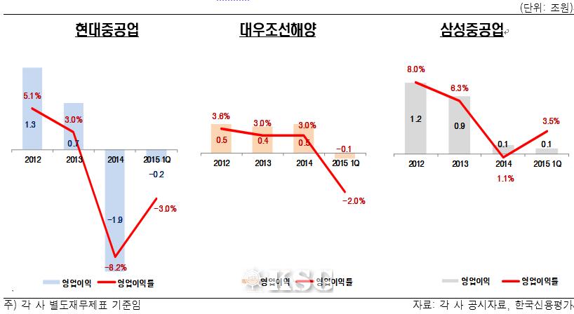 국내 대형조선 ‘빅3’로 불리는 현대중공업, 삼성중공업, 대우조선해양이 최근 신용등급 강등을 면치 못한 것으로 나타났다. 상선과 해양플랜트의 수주실적 부진과 조선사들의 수익구조 정상화가 지연되고 있다는 점이 신용등급 하락을 불러왔다는 게 신용평가사들의 공통된 견해다.