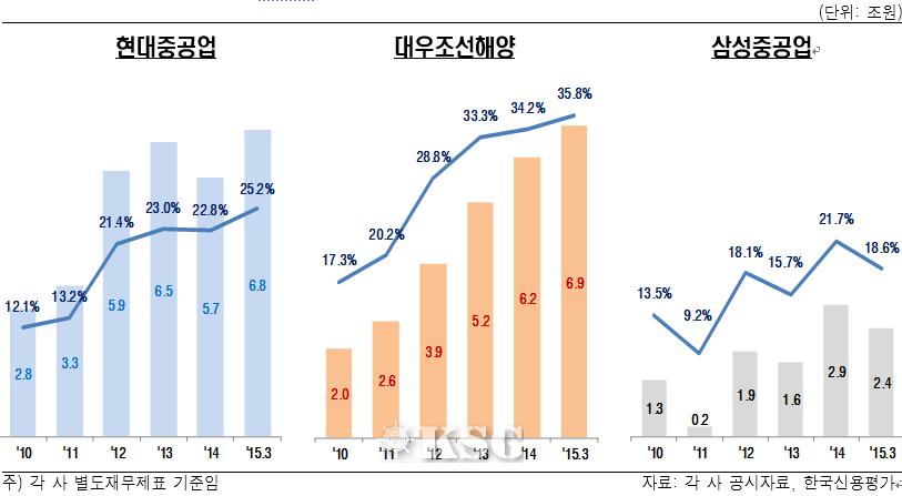 해양플랜트 부문에 대한 영업의존도가 높은 삼성중공업 역시 발주 침체 영향과 프로젝트의 정상적인 진행 여부가 중요한 포인트라고 한신평은 밝혔다.