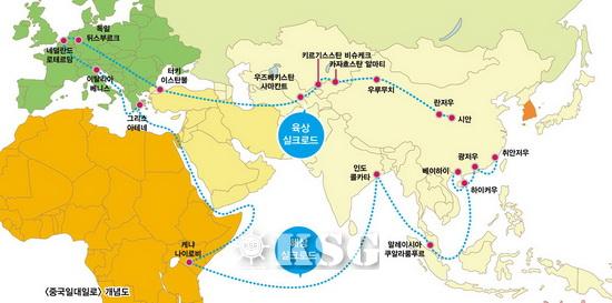 ●●●G2 반열에 오른 중국이 입지다지기에 한창이다. 중국은 과거 경제적 번영을 가져다 준 고대의 실크로드를 현대적으로 재건하기 위해 일대일로(一帶一路)라는 전략을 추진중이다. 바로 중국에서 유럽을 잇는 육상로인 新실크로드 경제벨트(一帶)와 해상로인 21세기 해상실크로드(一路)를 건설하는 것이다.