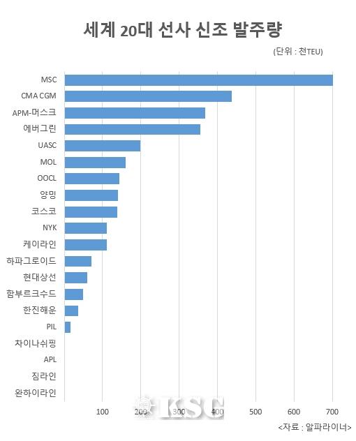 세계 1위 컨테이너선사인 덴마크 머스크라인이 1만8000TEU급 극초대형선(ULCS)을 인도받으며 선복량 300만TEU를 돌파했다. 2위 선사인 스위스 MSC는 막대한 신조 발주를 통해 머스크라인을 바짝 추격하고 있다. 우리나라 한진해운과 현대상선은 재정난으로 신조 투자에 신경을 쓰지 못하면서 선대 확장 속도가 더딘 모습이다.