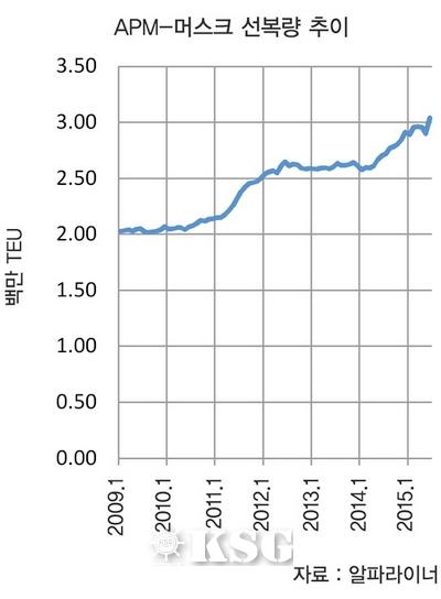 2M에 비해 경쟁선사들의 외형 확대는 느린 편이다. 세계 3위 선사인 프랑스 CMA CGM의 선복량은 174만8200TEU로, 두 선사에 한참 뒤처진다. 세계 8위인 한진해운은 62만8000TEU, 18위인 현대상선은 36만8500TEU의 선복을 운영 중이다. 양대 국적선사의 10년 전 선복량은 각각 29만1200TEU, 13만7000TEU였다.