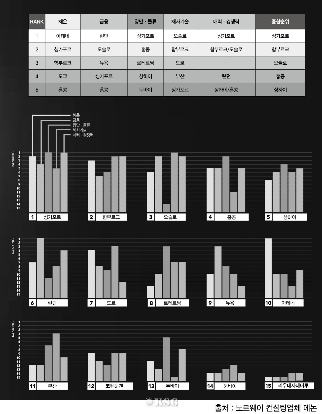 종합순위 1위는 싱가포르가 차지했다. 싱가포르는 5가지 항목 중 항만·물류와 매력·경쟁력부문에서 1위를 차지했고, 다른 3개 항목에서도 5위권에 들어 해운항만 분야에서 드높은 경쟁력을 보여줬다.
