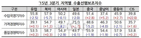 반면 일본지역의 수출선행지수는 조사 대상 지역 중 최저인 35.9를 기록해 대일(對日) 수출은 개선되기 쉽지 않을 것으로 보인다. CIS지역은 전분기 대비 16.2포인트가 상승한 45.9로 수출 여건이 빠르게 개선될 것으로 나타났다.