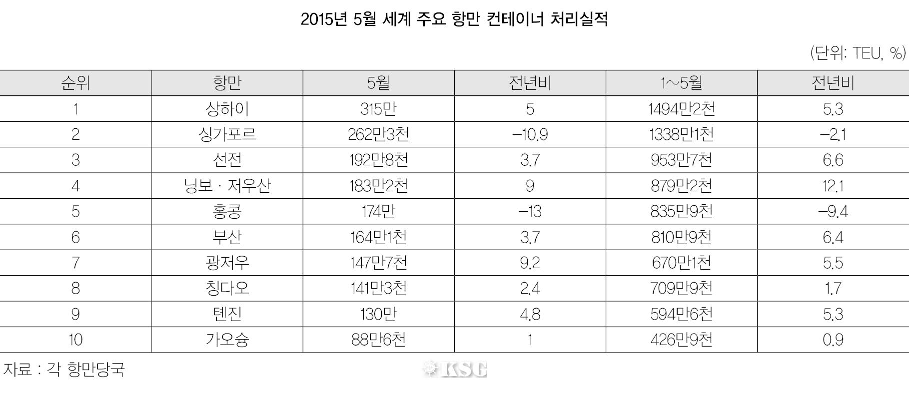 반면 세계 6위 부산항은 안정적인 성장으로 홍콩항을 쫓고 있는 모양새다. 올해 1월부터 5월까지 월간 처리실적에서 5개월 연속 증가세를 보인 부산항은 세계 5위 탈환을 노리고 있다.