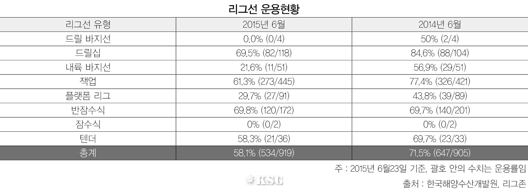 이밖에 또다른 형태의 해양플랜트인 리그(Rig) 운용률은 58.1%로 전월의 60.7% 대비 2.6포인트 감소했다. 리그란 석유나 천연가스를 채굴하는 반잠수식 시추 구조물이며 고정식이다. 지역별로는 북해(83.3%), 브라질(74.1%), 페르시아만(71%), 멕시코(60.2%)에서 높은 운용률을 보이고 있다.
