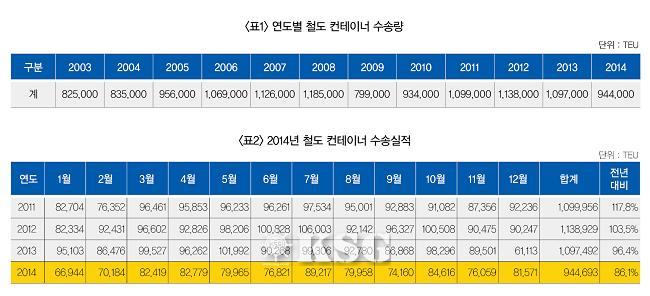 그러나 같은 기간 수출입 물동량이 증가했다는 점을 비춰 볼 때 이는 어설픈 변명에 불과하다. 2008년 전국 항만별 컨테이너 화물 처리 실적은 1792만7000TEU에서 2014년 2479만8000TEU로 38.3% 증가했다. 컨테이너 처리 물동량은 전년 동기 대비 5.7% 올랐고, 수출입 물동량은 전년 대비 4.7% 늘었다. 연도별 철도 컨테이너화물의 철도수송은 2006년 106만9000TEU, 2007년 112만6000TEU, 2008년 118만5000TEU으로 최고 정점을 기록했다. 이후 글로벌 금융위기의 여파로 2009년 79만9000TEU로 급감했다가 2010년 93만3000TEU, 2011년 109만9000TEU, 2012년 113만8000TEU를 기록했다. 그러나 2013년 109만7000TEU, 2014년 94만4000TEU로 다시 감소세로 돌아서면서 같은 기간 해운과 도로가 약 40%의 증가율을 보인데 비해 철도수송은 하락세를 이어갔다.
