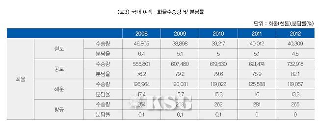 국토교통통계연보에 따르면 국내 화물수송 분담률 추이는 2008년 철도가 6.4%에서 2012년 4.5%로 감소한 반면, 도로수송은 76.2%에서 82.1%로 증가했다. 도로를 통한 수송은 꾸준히 늘었지만, 철도 수송량은 지속적인 감소세를 보인 셈이다. 과거 정부는 철도의 화물수송분담률을 2007년 8%에서 2013년 15%로 향상시키고, 2020년에는 20%까지 확대해 나갈 예정이라고 밝힌바 있다. 이 계획은 애당초 달성이 불가능했다. 또한 2011년 4월 제2차 국가철도망 구축계획에 따라 철도의 화물수송분담률을 2008년 8%에서 2020년에는 18.5%까지 확대하고 모달시프트(modal shift) 보조금 지원과 운영효율화 등을 추진할 전략을 밝혔다. 그러나 지금처럼 철도화물수송량이 감소하는 추세라면 목표달성에 대한 의문이 생길 수밖에 없다. 영국은 철도화물수송분담률을 1~2% 증대시키기 위해서 엄청난 재원을 철도에 투자했었다.