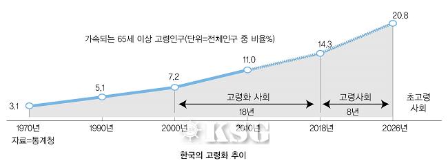 한국은 전 세계에서 가장 빠르게 고령사회로 진입하는 국가다. 전문가들은 지금과 같은 추세라면 2018년 고령사회에 진입하고 2026년이면 초고령사회로 접어들 것으로 예측하고 있다. 통계청에 따르면 현재 한국의 고령인구 비중은 13.1% 기록하고 있으며, 2017년에는 14%로 상승해 고령사회 진입, 2026년 20.8%로 초고령사회에 접어들 것으로 전망된다. 초고령사회로 인력난에 허덕이는 일본의 모습은 우리의 미래일지도 모른다.