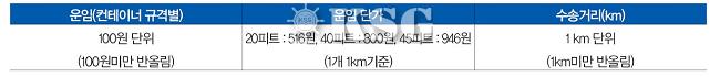 ※ 컨테이너화물의 최저운임은: 컨테이너 규격별로 100km에 해당하는 운임임.