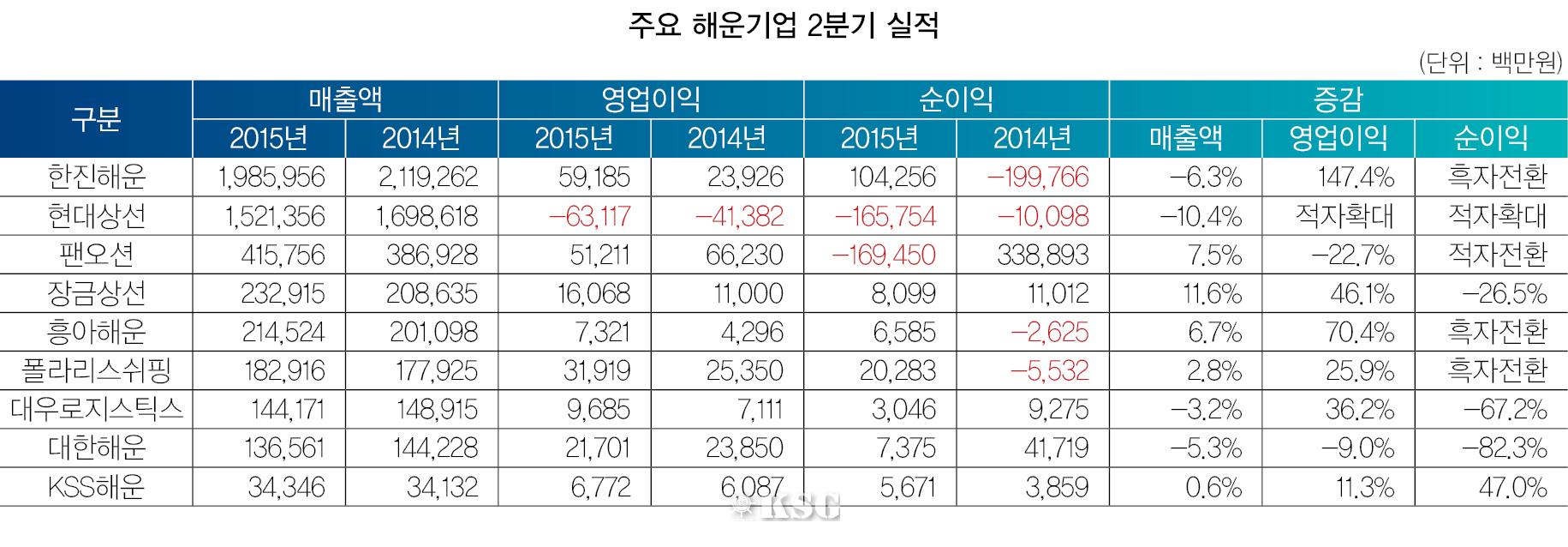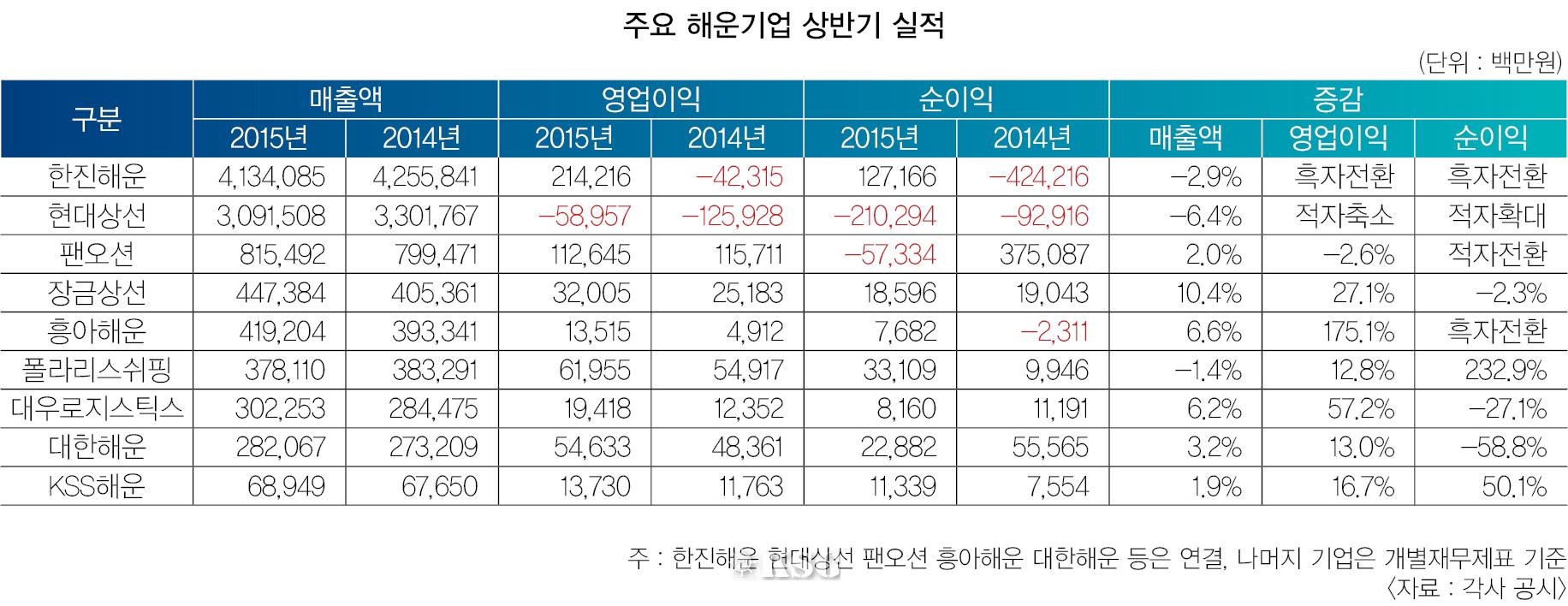 ●●●해운시황의 부진 속에서도 국내 주요 해운기업들의 영업실적은 호조를 보였다. 올해 상반기 실적을 발표한 9개 기업 중 7곳이 영업이익 성장세를 기록했다. 특히 한진해운은 오랜만에 상반기 흑자 성적을 내놨다. 지난해 하반기 이후 이어지고 있는 저유가 기조가 선사들의 선전 배경이다.