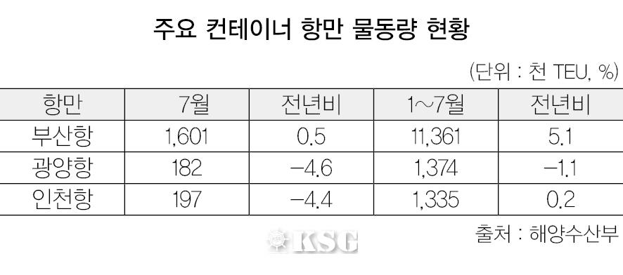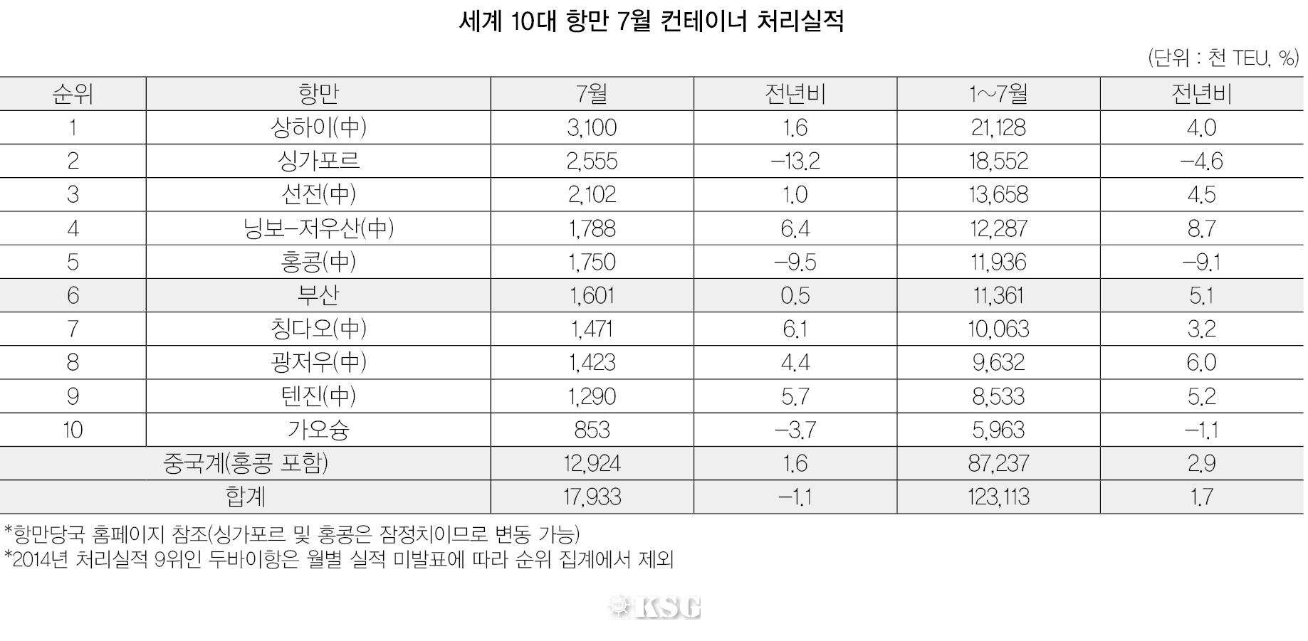 부동의 1위 자리를 지키고 있는 상하이항의 7월 한달간 컨테이너 실적은 310만TEU(20피트컨테이너)로 전년 동월대비 1.6% 증가했다. 싱가포르항은 255만5천TEU를 처리하며 2위를 지켰지만 전년대비 13.2%나 감소했다. 홍콩항은 전년대비 9.5% 감소한 175만TEU를 처리했지만 5위 자리를 유지했다. 부산항은 160만1천TEU를 처리하며 0.5%의 증가세를 보였지만 5위 홍콩항과의 거리를 좁히지 못하고 6위에 머물렀다.