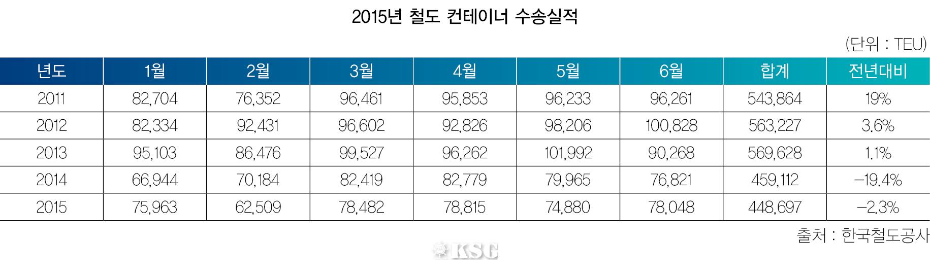 한국철도공사(코레일)에 따르면 올 상반기 철도 컨테이너 수송실적은 44만8697TEU를 기록, 지난해 같은 기간 45만9112TEU에 비해 2.3% 감소한 것으로 집계됐다. 지난해와의 비교에선 철도물량의 감소폭이 크진 않았지만 50만TEU 중반에 이르던 2013년 이전과 비교해선 크게 뒷걸음질 쳤다.