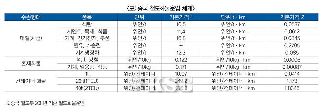 아래 내용은 중국의 철도화물 운임의 체계이다. 2011년 중국의 철도화물 수송량은 석탄(11.1억 t), 석유(7천만 t), 식량(5천만 t), 화학비료(4천만 t) 등 총 19.4억 t이다. 중국의 총 철도화물요금은 기본가격을 기준으로 한 화물운임에 철도건설기금, 하역비, 잡비, 위탁비 등의 부가비용을 합산하여 책정하고 있다.