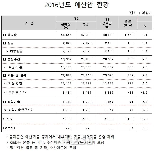 분야별로 보면 해운·항만 등 SOC분야는 2015년 대비 2.8% 증가한 2조3520억원이 편성됐고 수산분야가 2.9% 증가한 2조537억원, 해양환경분야와 과학기술분야가 각각 2189억원(8.4%↑), 1857억원(4.0%↑)이었다.