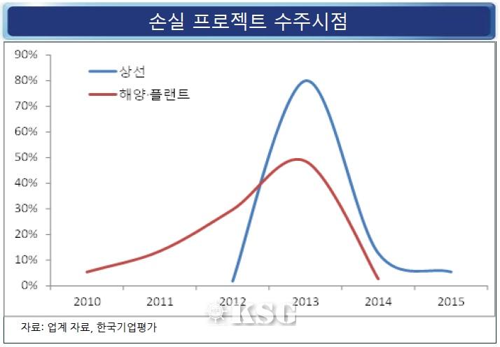 김 연구원은 금융위기 이후 상선 발주량이 급감하며 일거리를 확보하기 위한 조선사들의 경쟁이 심해졌다고 밝혔다. 또 해양플랜트 시장이 활성화되며 일감을 확보하기 위한 수주경쟁이 가열돼 저가수주가 발생했다며 대규모 손실원인을 설명했다.