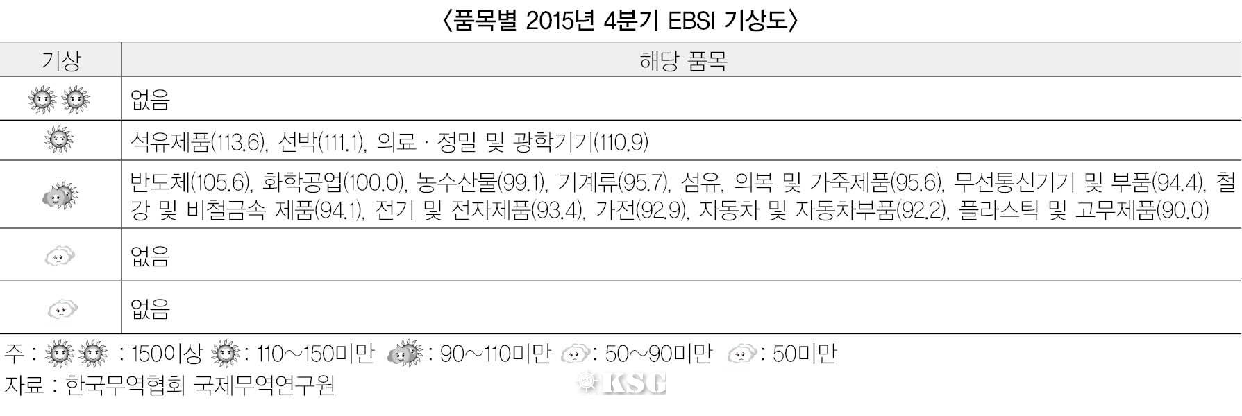한국무역협회 국제무역연구원이 국내 602개 수출업체들을 대상으로 실시한 ‘수출산업경기전망조사’에 따르면, 4분기 수출산업경기 전망지수(EBSI)는 100.4을 기록해 수출경기는 전분기 수준으로 예상됐다. EBSI는 0∼200을 갖는 지수로서 전분기에 비해 경기를 밝게 보는 의견이 많을수록 200에, 경기를 어둡게 보는 의견이 많을수록 0에 가까워진다.