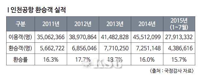 새누리당 김희국 의원이 공개한 ‘인천공항 외 7대 경쟁 국제공항 환승률 현황’을 보면 인천공항의 환승률은 2010년 15.7%에서 2014년 16.0%로 0.3% 증가한 반면, 일본 나리타 공항은 같은 기간 6.9%, 베이징·상하이 공항도 각각 5.2%, 3.9% 성장했다. 세계 7대 국제공항 중 하나인 독일 프랑크푸르트공항과 네덜란드 암스테르담의 스키폴공항의 환승률 역시 각각 11.1%, 8.4% 증가했다.