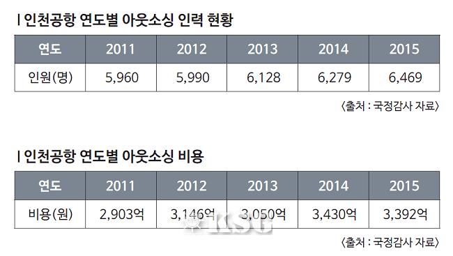 비정상적인 조직구조도 논란거리다. 새정치민주연합 이윤석 의원이 입수한 자료에 따르면 인천공항의 정규직원은 1032명, 외주용역 비정규직은 6469명으로 나타났다. 비정규직이 정규직을 6배 가량 넘어서는 수준이다. 인천국제공항은 외주용역 분야를 2011년 39개에서 올해 45개 분야로 확대했다. 이에 따라 2011년 39개 분야 5960명이던 외주용역은 2015년 8월 기준 45개 분야 6469명으로 증가했다. 같은 기간 용역금액도 2903억원에서 3392억원으로 급증했다.