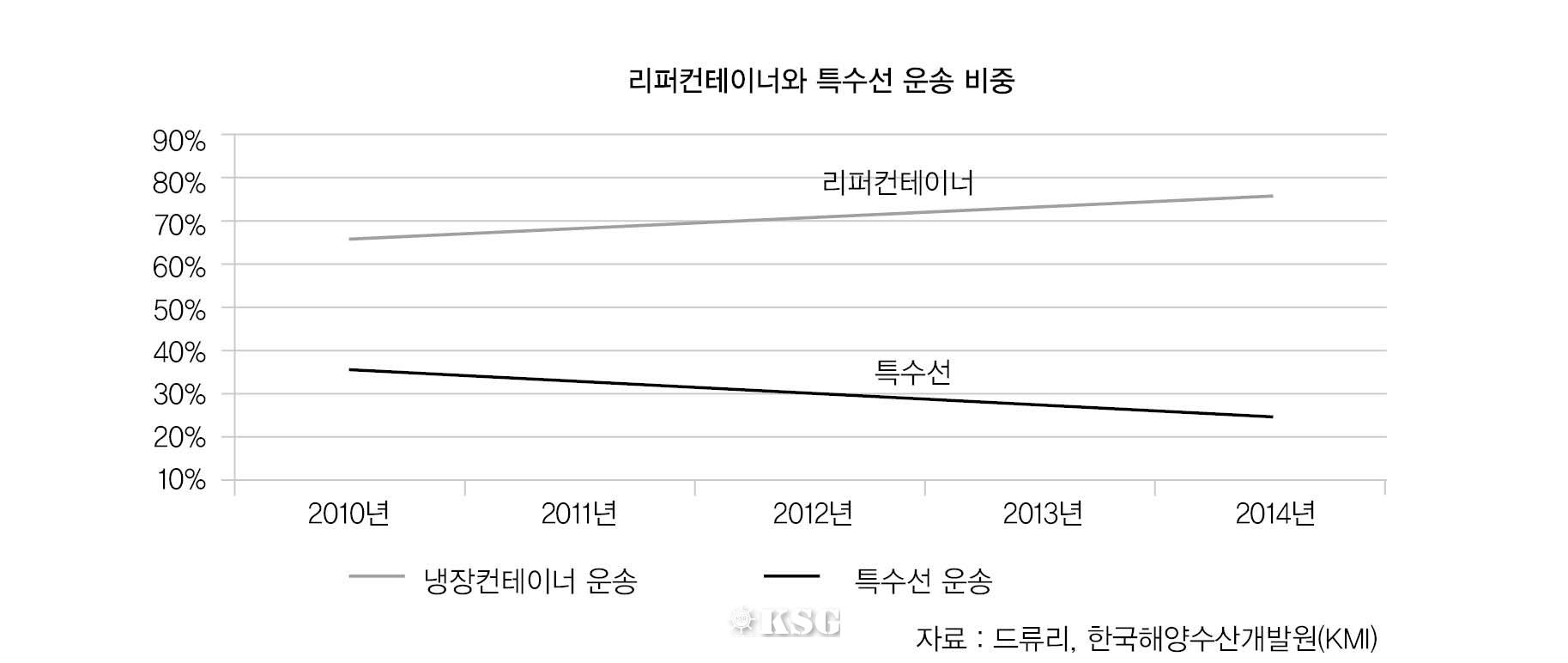 현재 냉장화물 운송은 특수선(냉동·냉장 전용선)이 아닌 리퍼컨테이너를 통해 대부분 진행되고 있다. 특수선이 아닌 냉장컨테이너를 이용한 해상운송 비중은 2014년 기준 전체 교역량의 4분의 3을 차지했다.