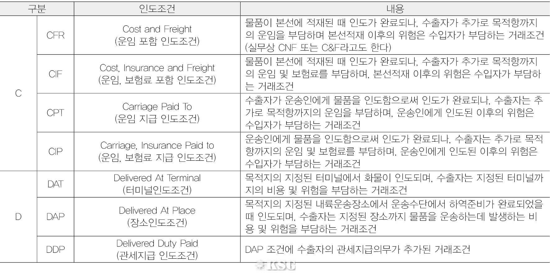 (1) 해상운송 및 내수로운송에만 사용되는 조건(해상운송 거래조건) : FAS, FOB, CFR, CIF