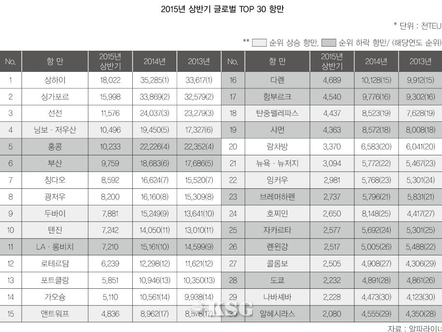 이밖에 중국 롄윈강항과 도쿄항의 하락세도 뚜렷했다. 중국 롄윈강항은 2013년 22위(548만8천TEU)에서 올해 상반기 26위로 추락했으며, 일본 도쿄항도 26위(486만1천TEU)에서 28위로 순위가 두 계단 떨어졌다.