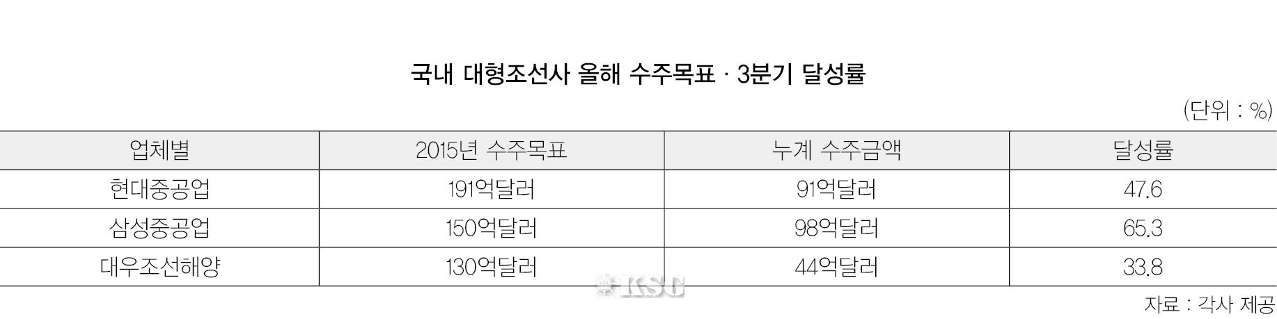 초라한 상반기 실적과 더불어 조선사들의 목표달성률 또한 기대치를 밑돌고 있다. 올해 3분기까지 절반 이상의 목표를 달성한 기업은 삼성중공업이 유일하다. 6~7월에 집중된 해양플랜트 수주가 없었더라면 더욱 힘든 4분기를 맞이해야했을 것이다.