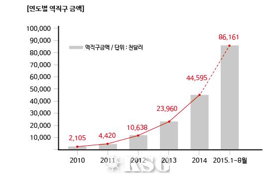 전자상거래를 통한 역직구는 최근 5년새 50배 가까이 성장했고 최대 수출 품목은 의류인 것으로 나타났다. 지난 10월29일 관세청이 발표한 전자상거래수출 동향자료에 따르면 2014년 9월부터 지난 8월까지 최근 1년간 수출금액은 1억829만달러로 전년 동기 3259만달러 대비 232.3%가 증가했다. 이는 2010년 한해 211만 달러와 비교할 때 50배 이상 증가한 수치로 연평균 115% 이상 수출규모가 커지고 있다.