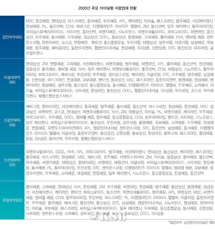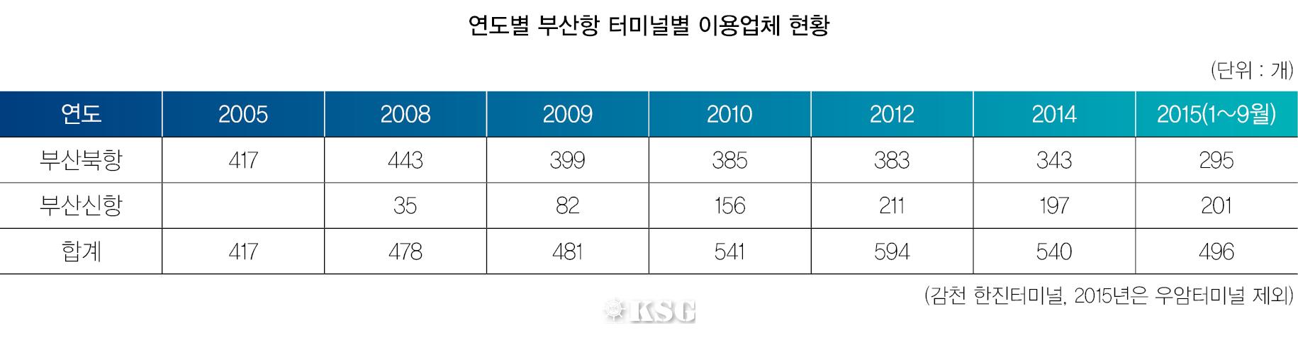 10여년 전인 2005년 부산항의 컨테이너 처리량은 세계 5위 자리를 기록하며 한국의 자존심을 지키고 있었다. 당시 부산북항에서 화물을 처리한 업체는 417개인 것으로 나타났다. 컨테이너와 벌크 화물을 처리할 수 있는 일반부두에는 103개의 업체가, 감만과 신감만, 자성대(한국허치슨)와 신선대부두에는 약 50~70개의 업체가 화물을 처리했다.