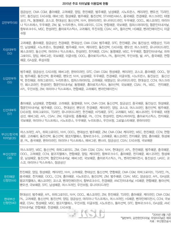 부산항의 올해 터미널별 신고업체는 총 496개인 것으로 나타났다. 부산항만공사(BPA)에 따르면 터미널별 화물신고업체 현황에서 부산북항은 295개, 신항은 201개의 선사 및 대리점이 부산항을 관리, 운영하는 BPA에 신고를 한 것으로 드러났다. 단 한 번이라도 부산항에서 화물을 양·적하한 업체들이 리스트에 이름을 올렸다. 북항과 신항의 여러 터미널에서 화물을 처리한 업체도 다수 존재했다.