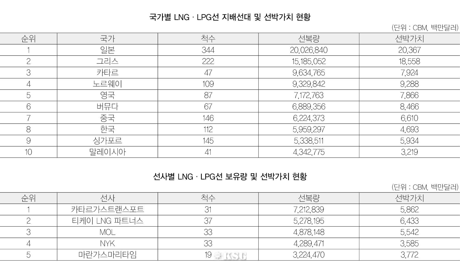 영국 해운조사기관인 베셀즈밸류닷컴에 따르면 일본은 지배선단 기준으로 액화천연가스(LNG)선과 액화석유가스(LPG)선 344척 2003만CBM(㎥)을 보유, 222척 1518만CBM의 그리스를 크게 앞서며 세계 1위 가스선 보유국가에 올랐다. 선박 시장가치에서도 일본의 가스선대는 203억6700만달러로 평가돼, 2위 그리스 선대를 18억달러 가량 웃돌았다.