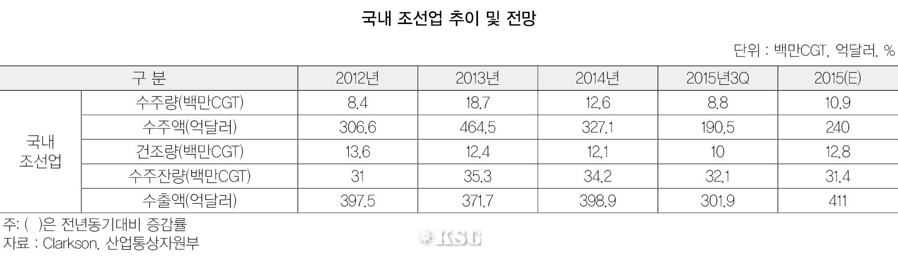 다만 건조량은 2013년 대량 수주 영향으로 전년 대비 약 6% 증가한 1280만CGT 수준으로 전망됐다. 수주부진으로 인해 수주잔량은 전년 대비 9% 감소할 것으로 예측됐다. 건조량의 소폭 증가와 드릴십, LNG선, FPSO(부유식 원유생산저장하역설비) 등 고가물량의 인도 수출은 3% 증가할 전망이다.