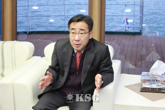 | ▲ 박광열 인천해수청장이 <에코누리>호에 승선해 인천신항 개발 계획에 대해 설명하고 있다. |