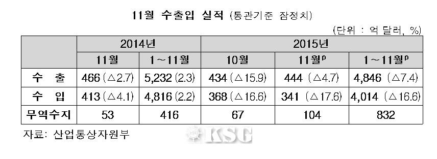 우리나라의 무역수지는 104억달러로 월간 무역수지 사상 최대 흑자를 시현했다. 특히 유가 등 원자재 하락으로 수입이 큰 폭으로 감소해 월간 무역수지의 흑자규모는 100억달러를 상회했다.