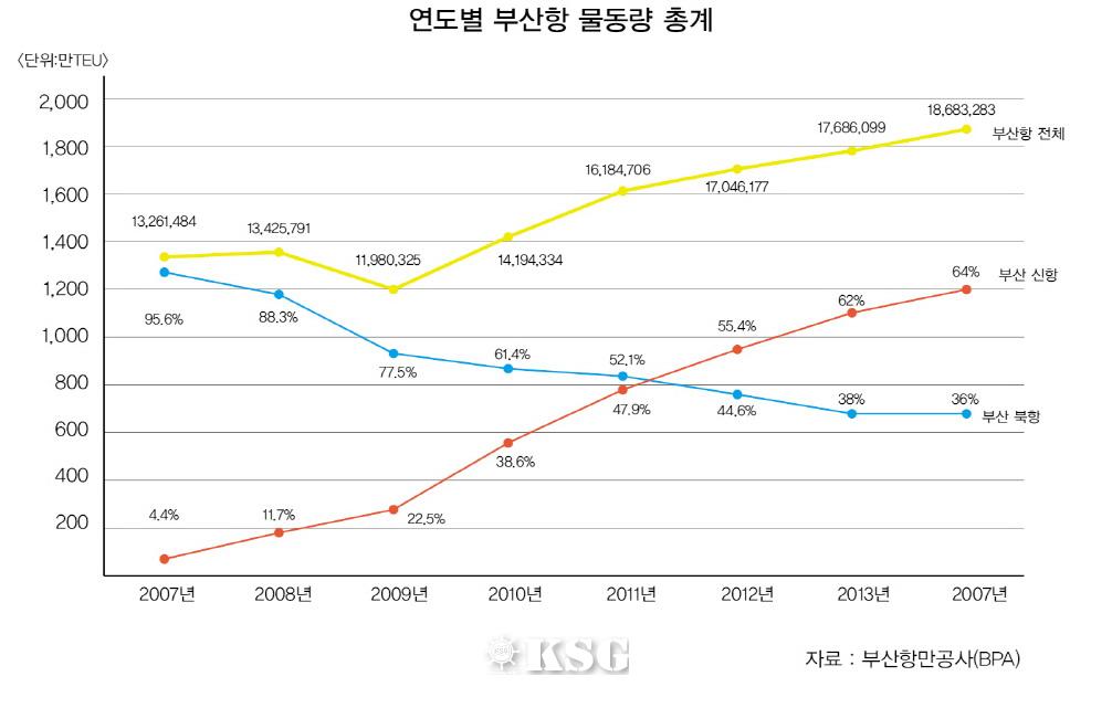 특히 2012년에는 처음으로 부산항 전체 물동량의 과반을 넘어선 뒤 2013년 62%, 지난해 64%를 기록하는 등 불과 10년 만에 주객이 전도되는 상황을 연출했다. 북항내 TOC들은 기항하는 선박수의 급감과 낮은 하역료로 이해 더 이상 인내하기 힘든 실정에 이르렀고 결국 BPA와의 길고 긴 협의를 거쳐 오늘의 운영사 통합에 이르게 됐다.