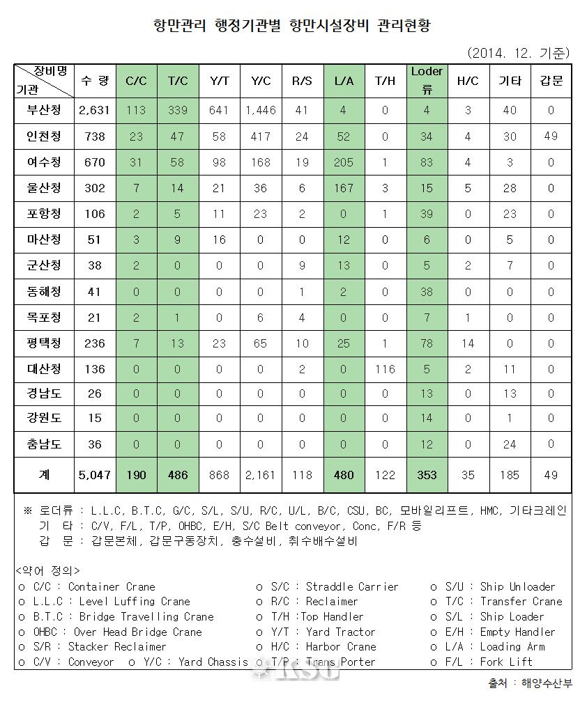 해수부에 따르면, 이번 항만법 일부 개정으로 지난해 말 기준 전국 항만에 설치·운영되고 있는 1509대의 고정식·이동식 하역장비가 혜택을 받을 수 있게 됐다.