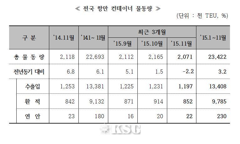해양수산부는 2015년 11월 전국 무역항에서 처리한 항만물동량은 총 1억 1680만t으로 전년 동월 대비 2.6% 감소했다고 지난달 28일 밝혔다. 이 중 수출입화물은 9557만t, 연안화물은 2123만t을 차지했다.