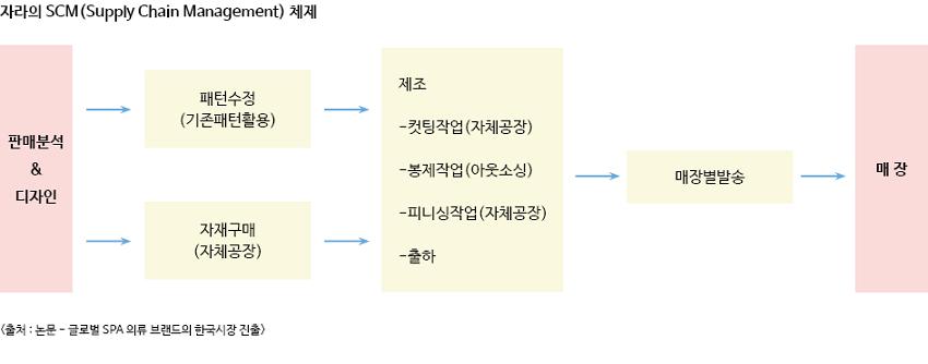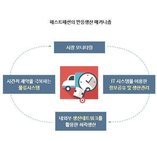 특히 자라는 ‘기획, 디자인, 생산부터 매장 배송’까지의 과정을 단 2주 만에 완료할 수 있는 ‘반응생산’ 체제를 구축해 대표적인 패스트패션 업체로 주목받고 있다. 자체 공장에서는 주로 ‘트렌드에 민감한 디자인’ 의류를 생산하는데, 15%는 사전에 생산하고 나머지 85%는 고객의 반응을 살피고 생산한다. 공장별로 원단 등 생산자원을 충분히 확보하고 생산라인 가동률을 여유 있게 유지함으로써 갑작스런 생산량 증가에도 유연하게 대처한다. 또 축구장 50개 규모의 본사 물류센터에서는 1시간당 6만벌의 의류에 가격표를 부착하고 즉시 판매가 가능한 상태로 포장해 최대 40시간 안에 전 세계 매장으로 배송할 수 있는 시스템을 갖추고 있다.