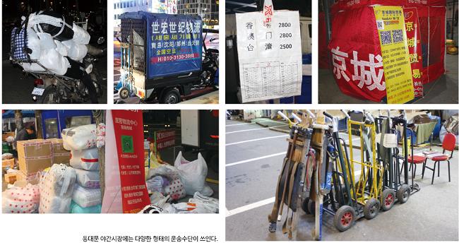 공장에서 도매로 도매에서 다시 소매로 물품이 운송되는 과정에선 자전거, 이륜차, 라보, 다마스, 택배차, 용달차, 5톤, 버스 등 다양한 운송수단이 동원됐다. 지게를 이용해 물품을 배달하는 지게꾼의 모습도 눈에 띄었다. 얼핏 보면 동대문의 공급망은 체계가 없는 듯 보이지만, 자세히 들여다보면 기획, 생산, 유통 등 전과정이 하나하나 촘촘하게 잘 짜여있다.