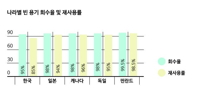 환경부에서 제공하는 자료에 따르면 우리나라의 소주ㆍ맥주병 회수율은 95%로 다른 선진국과 비슷한 수준이다. 그러나 회수되는 과정에서 파손되는 비율이 높아 실제 재사용되는 비율은 85%에 그치고 있다.