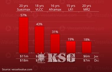 영국 선가조사기관인 베셀즈밸류닷컴에 따르면 유조선 가격은 지난 한 해 최대 57%까지 급등했다.