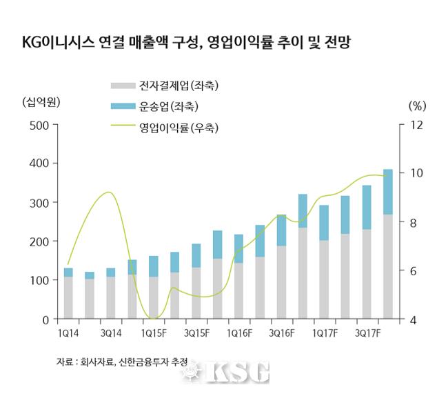 KG그룹은 온라인쇼핑의 첫 단인 결제와 끝단인 배송을 모두 확보했다. KG이니시스는 기존에 보유하고 있는 가맹점 데이터를 기반으로 고객사에 다양한 제안을 할 수 있다. 또 쿠팡의 로켓배송을 필두로 다수의 유통기업이 배송품질 향상을 위해 심혈을 기울이고 있는 상황에서 KG로지스는 규모의 경제가 아닌, 단가인상을 통한 배송서비스 품질 향상을 통해 차별화에 나서고 있다. 이는 기존 택배사와 차별화된 서비스로 프리미엄 배송시장을 새롭게 개척하려는 의도다. 다만 KG로지스가 전체 택배시장에서 차지할 수 있는 최대 점유율은 10%에 불과해 성장성은 제한적이다. 그러나 인수합병, 인프라 확장을 통한 성장 가능성은 열려있다.