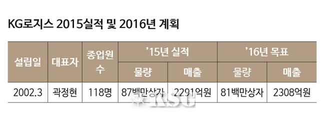 KG로지스는 1월 27일 기자간담회를 열었다. 곽정현 대표는 이날 KG로지스로 조직을 통합한 뒤 안정화를 최우선으로 내실강화에 집중한다고 설명했다. 또 택배단가 인상 및 서비스 다각화를 통해 수익성을 개선해 나갈 계획을 밝혔다. KG로지스는 2016년 목표 매출액 2308억원, 택배 물동량 8100만건을 제시했다. 매출액은 2015년 대비 소폭 증가했지만, 물동량은 600만건 감소한 수치다.