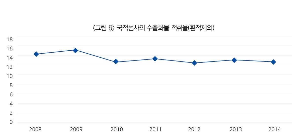 정부는 퇴출되는 선사의 화물이 자국 선사들에게 돌아가지 않는다는 과거의 경험을 기억하고 양대 선사들이 자구노력에 걸맞는 유동성 지원방안을 마련하여야 한다. 또한 약탈적 운임시장에서 국적선사의 적취율을 제고할 수 있도록 선화주협의체를 통해 ‘불황기 화주의 협력에 대한 호황기 선사의 화주 배려방안’ 등에 대한 협의를 적극적 유도하여 2009년도의 15.24%에서 2014년 12.72%로 하락한 국적선사의 적취율이 회복될 수 있도록 노력하여야 한다.