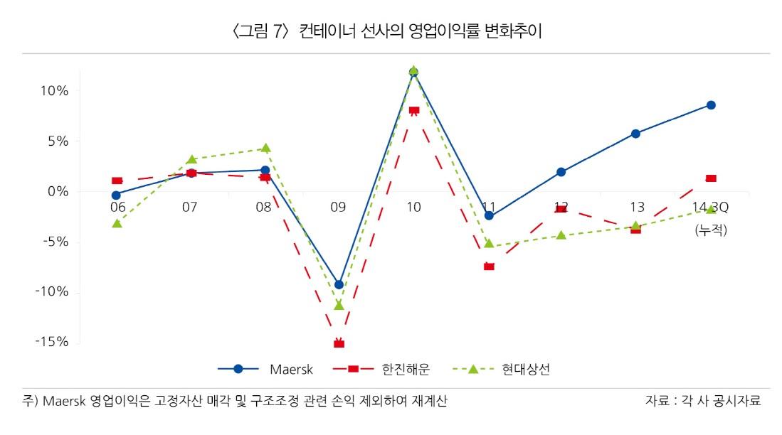 같은 해운불황에도 2012년 영업이익을 흑자로 전환시킨 머스크사의 영업이익률 변화추이를 한진해운 및 현대상선의 그것과 비교해보면, 2007~2008년 해운호황기가 절정일 때 머스크사의 이익률은 한진해운이나 현대상선보다 낮지만 2009년 이후 불황기시의 이익률은 상대적으로 높은 것을 알 수 있다. 그 원인으로 머스크사의 항로가 다변화되어 있는 점과 다양한 사업영역을 가지고 있는 점 등을 꼽을 수 있지만 가장 중요한 것은 호황기때 불황기에 대비한 투자가 이루어지고 불황기에 호황기를 준비하는 노력의 결과라 할 수 있다.